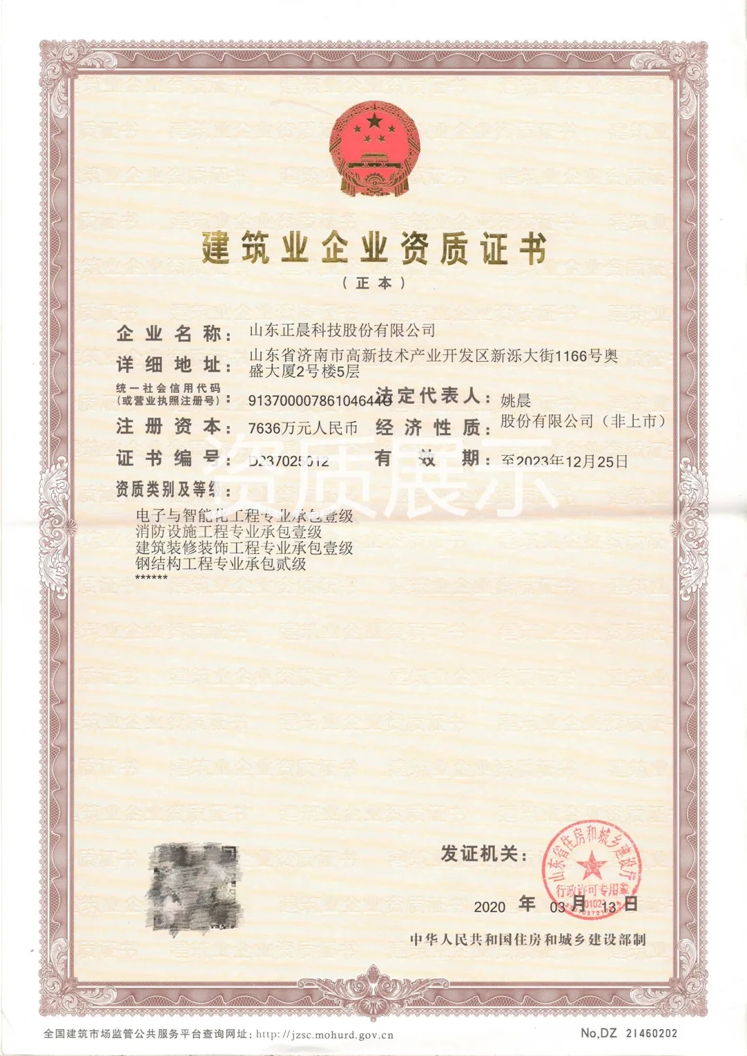 近日,正晨公司资质升级工作再传喜讯,经济南市行政审批局核准,正晨公司申报的钢结构工程专业承包贰级资质成功获批。