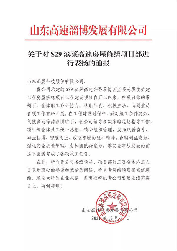 近日,时搏网页版登录入口-时搏(中国) 承建的S29滨莱高速公路淄博西至莱芜段改扩建工程房屋修缮项目获得业主表扬!