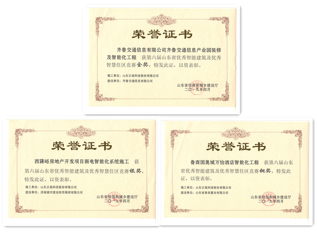 山东正晨作为参赛单位,本次共申报三个项目,最终全部斩获奖项,载誉归来。其中,申报的齐鲁交通信息有限公司齐鲁交通信息产业园装修及智能化工程获得大赛金奖,西蒋峪房地产开发项目弱电智能化系统施工获得大赛银奖,鲁商国奥城万怡酒店智能化工程获得大赛铜奖,最终获得了1金1银1铜的好成绩!