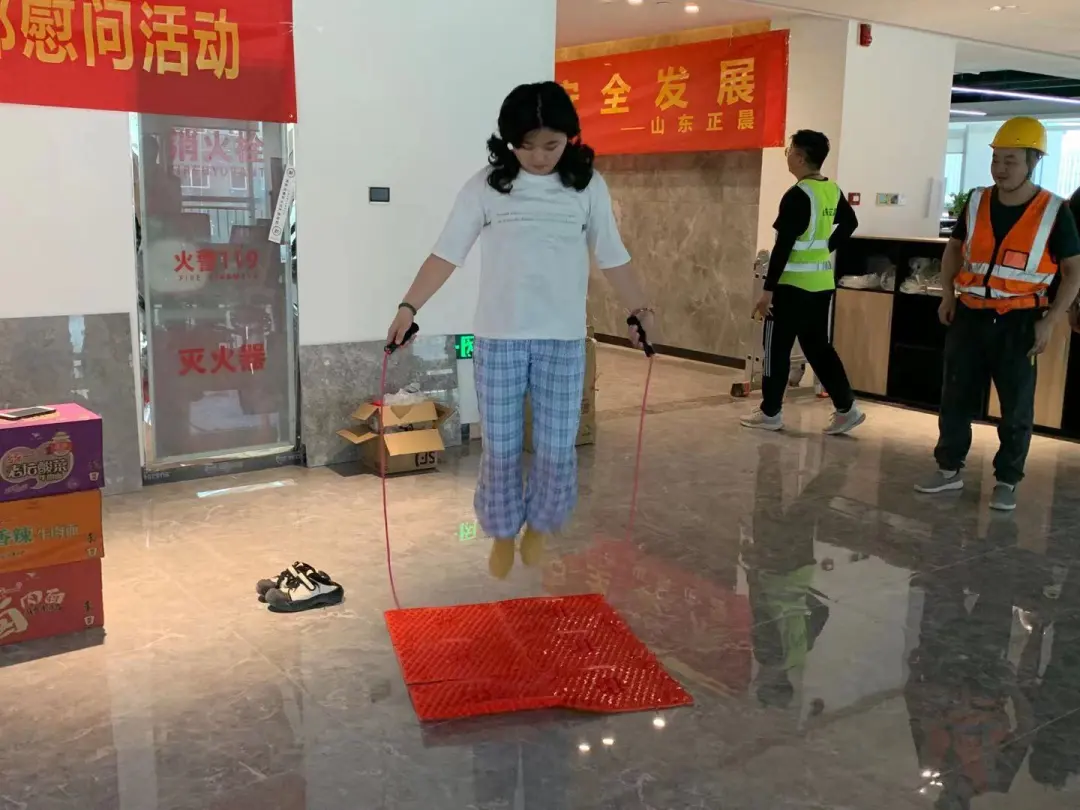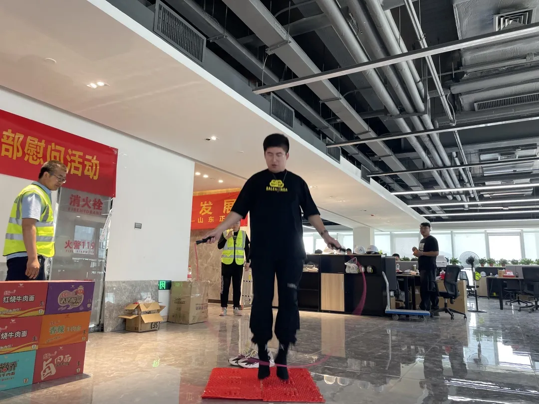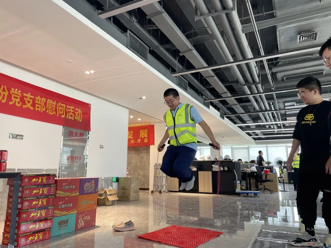 紧接着进入了互动游戏环节,正晨股份党支部准备了筷子夹豆子挑战、指压板跳绳、吃西瓜大赛等游戏与项目职工共度欢快节日。