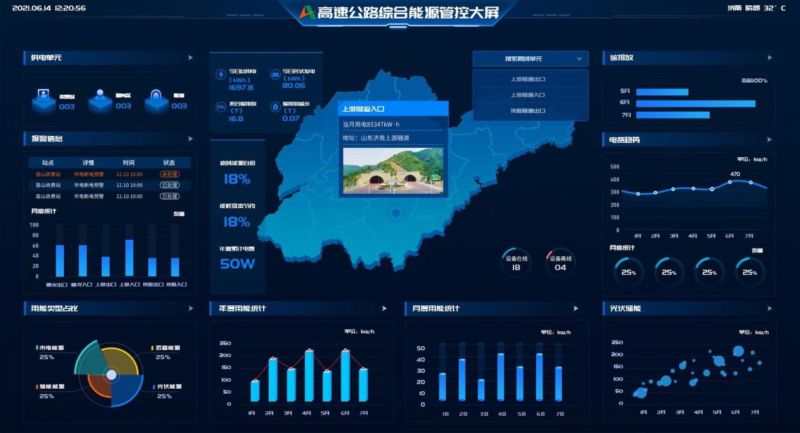 综合能源管控平台融合物联网、云计算、大数据等技术,对高速公路不同用电场景内机电设备进行分布式监控和集中监管。通过高效的数据采集、全天候的智能运维、智能化的能源调度、精确的用能数据分析,保证智慧高速设备电力连续稳定、高品质的供给,实现绿色运营、推动低碳循环。