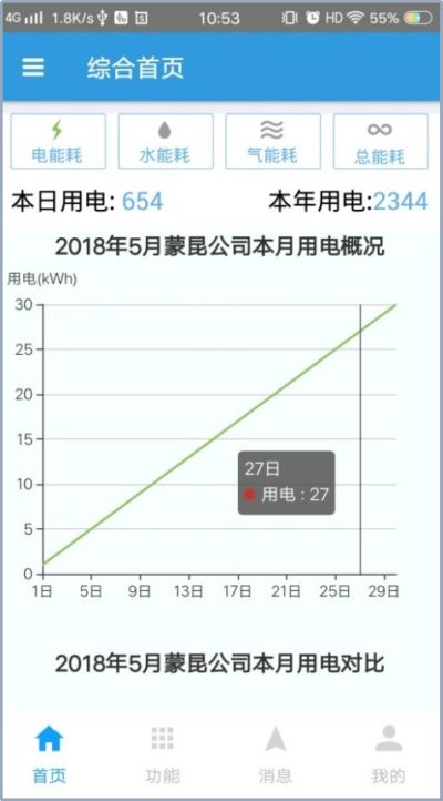用户在手机页面查看关心的每个区域的用能数据简报,  系统默认根据不同用户的角色,提供不同的区域以及简报内容。