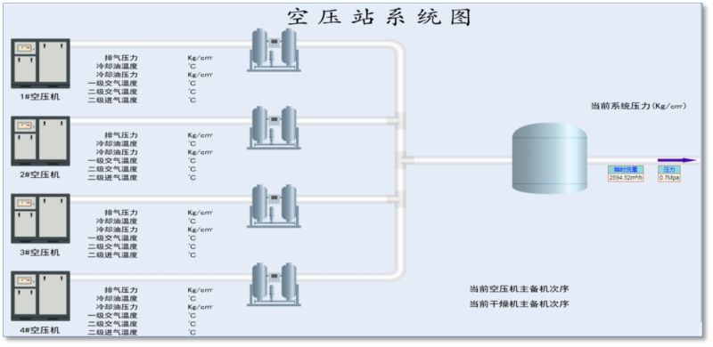 Ø 空压机群管理:实时检测空压机排气压力温度、运行状况,依据用气情况合理控制空压机运行数量,平衡空压机运行时间。对空压机运行异常进行报警,并对空压机运行情况进行记录、存储。